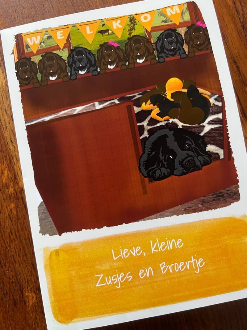 9 mei krijg ik deze prachtige zelfgemaakte kaart op de post, alle broes en zusjes kijkend in de kist met puppy's,