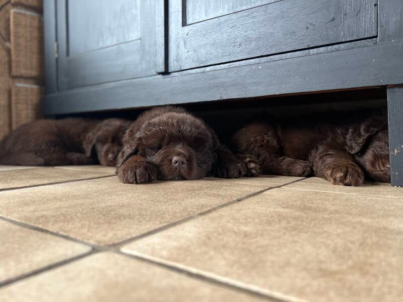 Om 17.15 waren ze allemaal geboren, 8 prachtige puppy's: Siep, Jos, puck drie zwarte reutjes, Juul, Loek, Tomke onze bruine kereltjes, twee bruine teefjes Pluk en Kris.